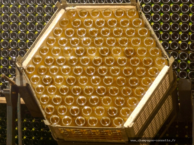 Les bouteilles sont placées à l'horizontal sur un pupitre en bois, puis tournées et inclinées chaque jour à la main. Cette opération manuelle dure environ 1 mois.