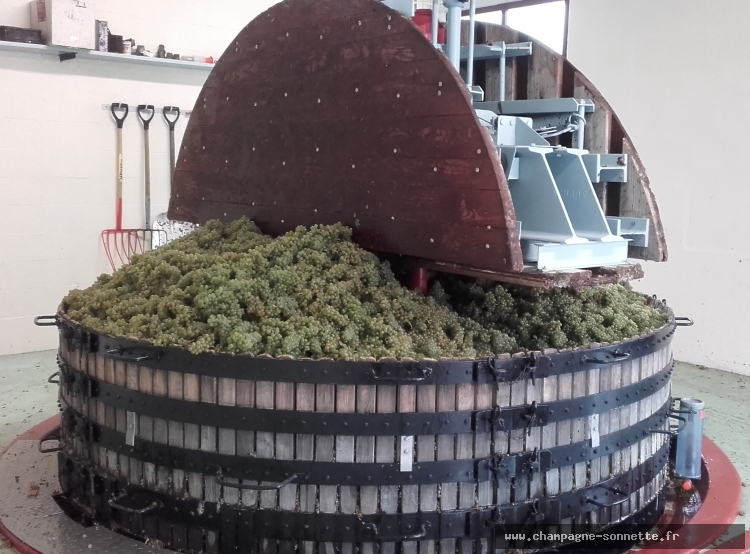 Nos raisins sont pressés directement à la propriété. Notre pressoir traditionnel de marque "Coquard" (4000 kg) nous permet d'assurer une qualité et un suivi dans l'élaboration de nos champagnes. Il témoigne de notre respect de la tradition champenoise.